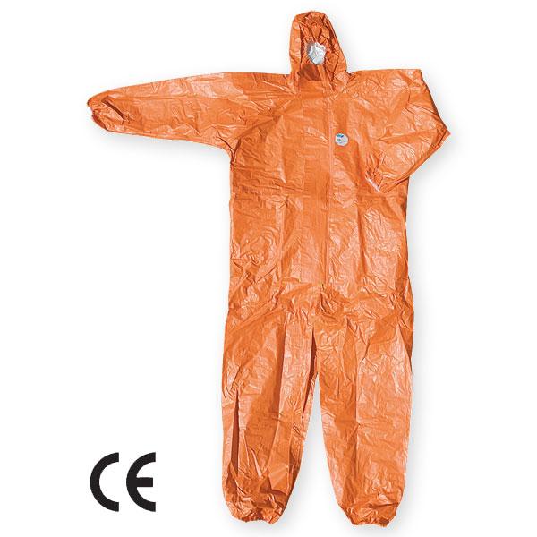 Characteristics: Perfect barrier against solid and liquid noxes • Impermeable for aerosol and inorganic acids and alkalis • Used in decontamination work • Ideal protection against toxic chemicals • Covered zipper closing • Elastic at hands, ankels, waist and hood.